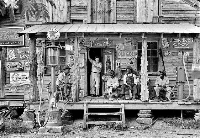 The two men were photographed during the summer of 1938. In these years there was often not much work for farmers to do at harvest season, and plenty of time for conversations, on the edge of fields or in the crossroads towns, in which farmers would keep their morale up by pretending to be interested in buying each other's land.