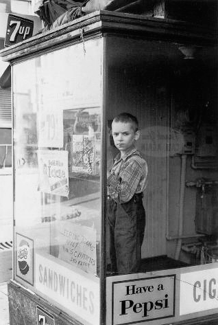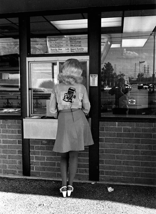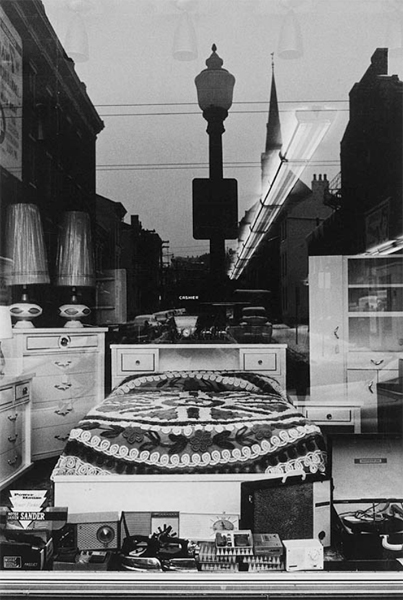 The larger, dark figure reflected in the shop window is (obviously) the photographer. Friedlander has made many such fugitive and elliptical self-portraits, partly no doubt because of the easy accessibility of the subject, and partly because of his fascination with transparency and reflection in relationship to the picture plane, and partly because such pictures remind him later of where he has been and what it felt like to be there. The small figure in the bright square over the photographer's heart is also the photographer, reflected in a mirror in the rear of the store. The man standing by the Mustang (like the donor in the altarpiece) is merely a bystander, wondering what the photographer might be looking at.