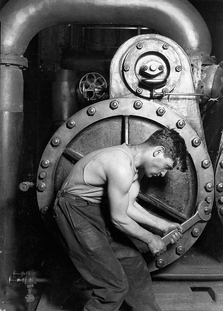 With the Graflex on the other hand, he saw his picture just as the camera would record it until the very instant that he pushed the trigger. This meant that he could frame his subject boldly, to the very edges of the plate; he could change his angle of view at the last moment; he could focus selectively on the most important plane of his subject, allowing the nearer and farther planes to be recorded out of focus. His picture is characteristic of the new kind of graphic economy and forcefulness that Hine helped discover for photography.